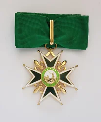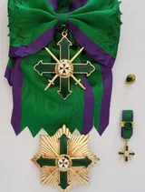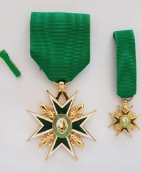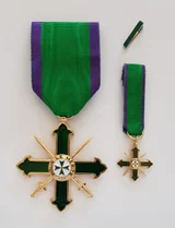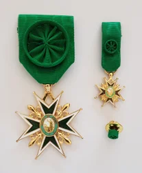 Cordon de sinople et bandes amarantes – plaque portée à gauche en plus de la cravate de Chevalier
